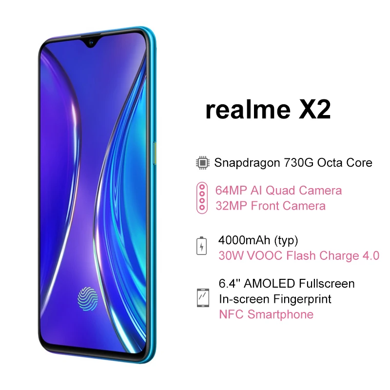 buy Global Version realme X2 8GB 128GB NFC 6.4" Mobile Phone Snapdragon 730G 64MP Quad Camera Cellphone